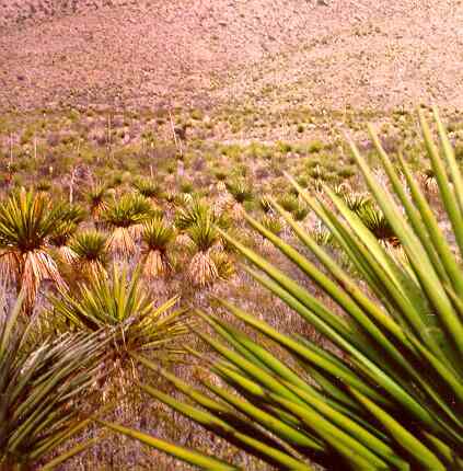 The torrey yucca is a characteristic Chihuahuan Desert species, though closley related to other "Spanish daggers" such as the banana yucca. The evergreen leaves are yellow-green in colour, long and broad, with a sharp tip. The dead leaves hang down as a skirt around the stem. |