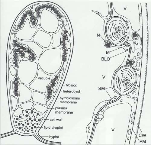 mitochondrion (M), nucleus (N), Nostoc cell (N),