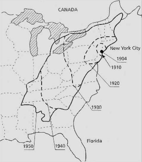 Fig 9.13 Recorded spread of chestnut blight caused by Cryphonectria parasitica after it was first recorded in New York in 1904.