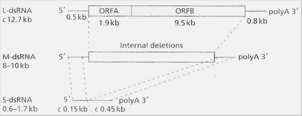 Fig 9.15 Double-stranded RNA of hypovirulent strains of C. parasitica. Large (L) dsRNA is the full-length molecule comprising two conserved end regions and a central coding region of two open reading frames (ORF A and ORF B) which confer hypovirulence. Medium (M) and small (S) dsRNAs are also commonly found in hyphae. They are internally deleted copies of the L-dsRNA.