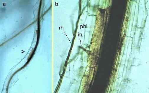 Fig 9.11 A wheat root at different magnifications, infected by the take-all fungus, Gaeumannomyces graminis. The fungus grows on the root surface as dark runner hyphae (rh) then invades the root cortex by infection hyphae (ih), destroying the phloem (phl) and causing intense discoloration and blockage of the xylem. [© Jim Deacon]