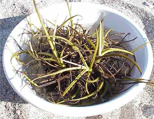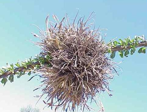 "Ball moss" growing on the stem of an ocotillo in the Baja California peninsula of Mexico, where winds from the Pacific Ocean carry moisture-laden air. It forms a tangled mass of leaves which are dry and grey coloured for major parts of the year but which rapidly hydrate and turn green when exposed to moisture.